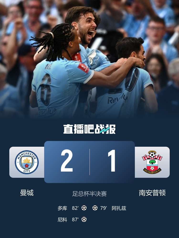 连续四年进决赛!曼城2-1南安普顿 尼科世界波绝杀多库破门