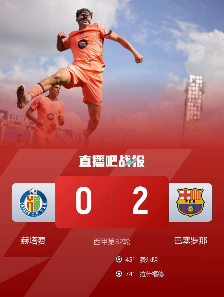 11分领跑!巴萨2-0赫塔费联赛9连胜 费尔明破门拉什福德建功