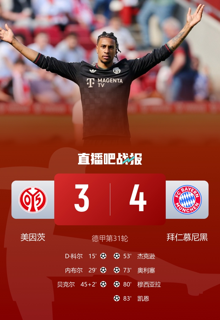 让3追4!拜仁4-3逆转美因茨迎9连胜 奥利塞世界波凯恩破门