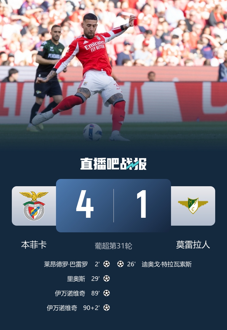 三连胜!本菲卡4-1莫雷拉人先赛距榜首4分 巴雷罗传射里奥斯破门