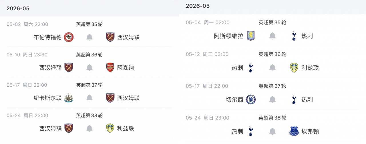在剩余四轮英超赛程中,西汉姆联将先后对阵布伦特福德、阿森纳、纽卡斯尔联和利兹联;热刺将先后对阵阿斯顿维拉、利兹联、切尔西、埃弗顿。