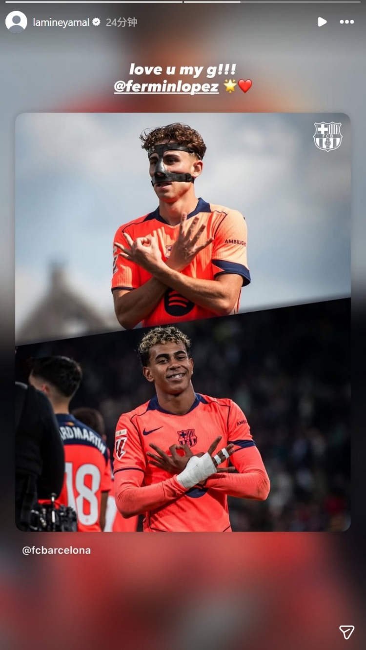 费尔明做同款庆祝动作致敬受伤的亚马尔,后者社媒晒照:爱你兄弟
