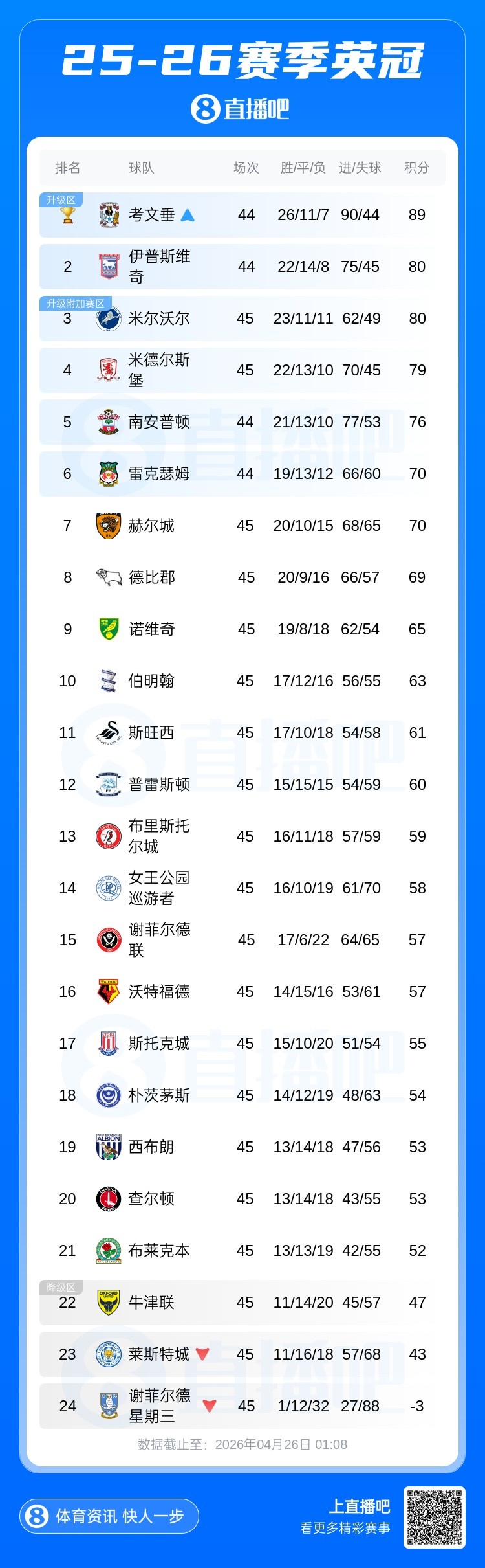 谢周三本轮英冠输球后积分仍为-3分,仅剩一轮积分最多也只能归零