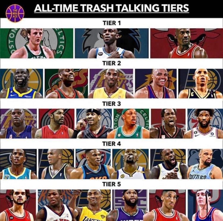 知名外网论坛Reddit发布了一张NBA历史球星垃圾话水平分档图,“大鸟”伯德、加内特和乔丹高居第一档;追梦、科比等在二档、奥尼尔、艾弗森、大帝等在第三档;保罗、威少、杜兰特、狄龙等在第四档;慈世平、考辛斯、皮蓬等在第五档。
